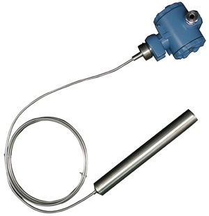 投入式液位計由內(nèi)置毛細管、防壓縮接頭和探頭的專用導纜組成。探頭是由一個不銹鋼圓筒,底部有一個隔膜,上面蓋有一個帶孔的不銹鋼外殼。液位測量是測量探頭的液體靜壓力與實際大氣壓力差,然后由傳感器(附不銹鋼膜)和差壓電子元件為4 ~ 20mA輸出信號。
